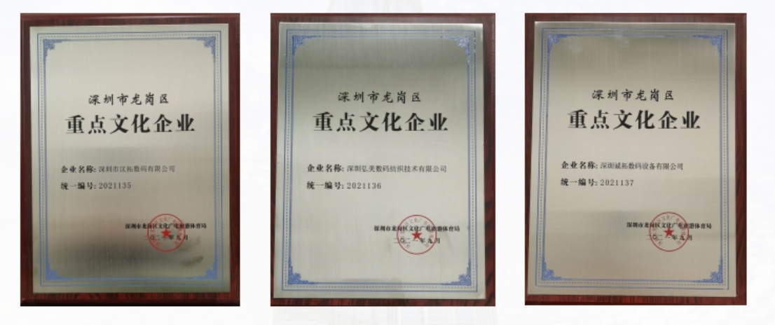 2021年深圳市龙岗区文化创意产业园区、文化创意产业公共服务平台及重点文化企业名单公布,UV打印机国内高端品牌午夜福利免费在线观看数码以及同属汉弘集团旗下的弘美、诚拓被深圳市龙岗区文化广电旅游体育局授予“龙岗区重点文化企业”称号。