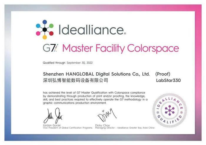 近日,UV打印机高端品牌午夜福利免费在线观看数码兄弟公司弘博智能工业级数字标签机LabStar 330获得了美国IDEAlliance(国际数码企业联盟)颁发的G7认证最高级别认证证书—G7 ColorSpace级别,成为国内首台通过G7最高级别认证的数字喷墨标签机。弘博智能也因此成为中国数字喷墨印刷设备领域鲜有的获得G7最高级别认证的设备厂商。